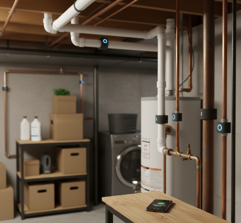 We designed around an acoustic sensing system - a flexible pipe-wrapping band with a built-in microphone that listens for anomalies like trapped air, pressure changes, water hammer, hissing from pinhole leaks, and gurgling from blockages. My focus was on translating this complex sensor data into an experience homeowners could actually understand and act on.