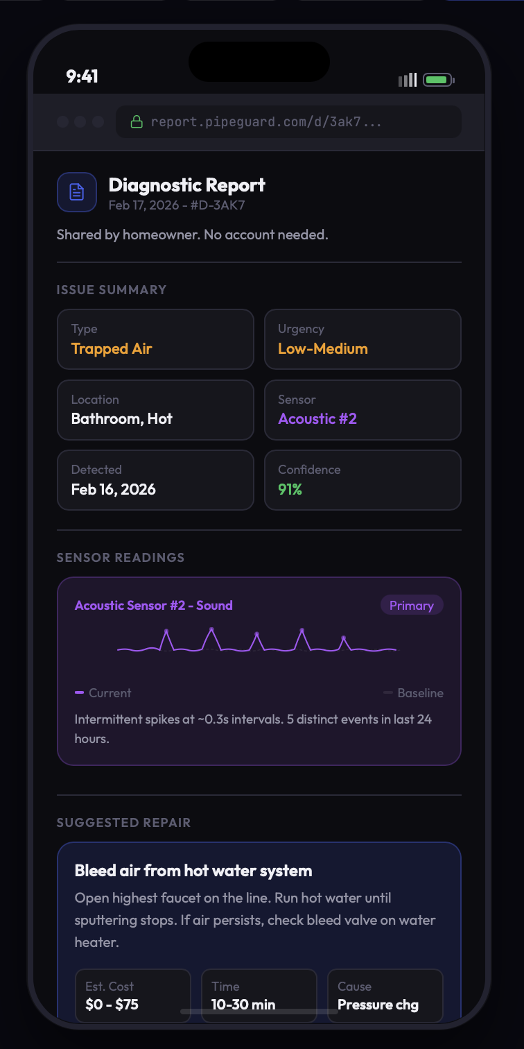 A web-based diagnostic report the homeowner shares via link. Contains issue type, location, acoustic data, baseline comparison, and suggested repair with cost and tools. No app download required.